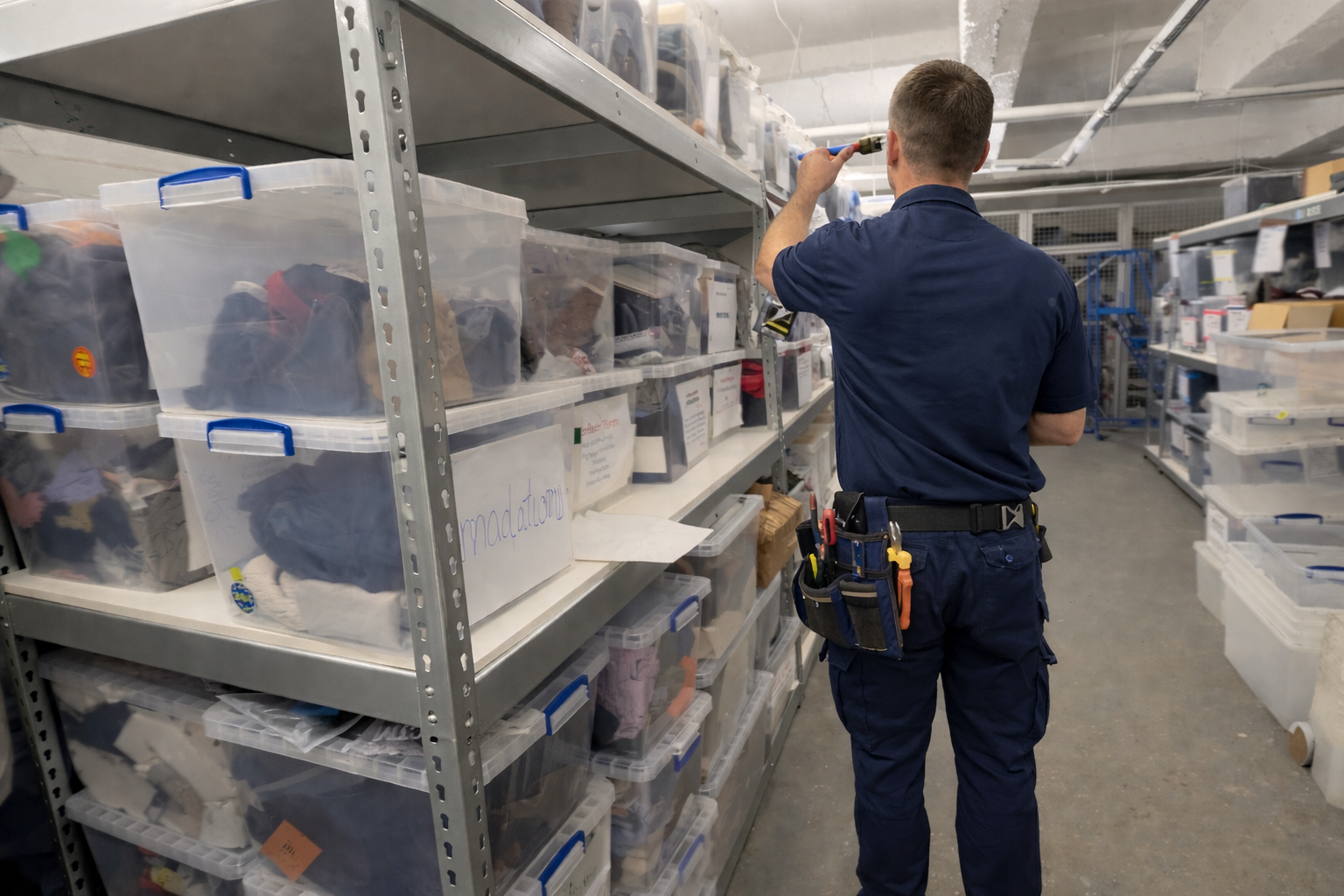 Every crate is then labelled and logged into a simple digital inventory system. Using a mobile app, your team can instantly locate any box, see exactly where it belongs, and return it to its correct shelf. Adding new items is just as easy. New crates can be labelled, logged, and assigned their own space within the system.