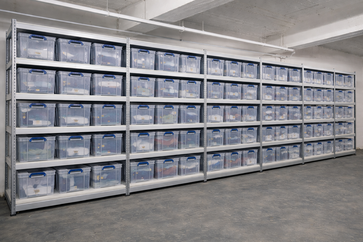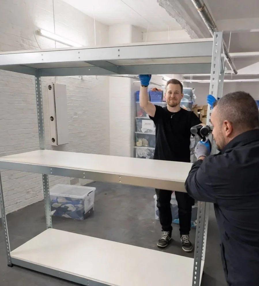 Our process usually begins with a full clear-out and reorganisation of the stockroom. Working with your team, we sort through existing materials, remove outdated or unnecessary items, and repack what remains into durable, uniform storage crates. Once the space is cleared and optimised, we install professional racking systems designed to maximise the available space.